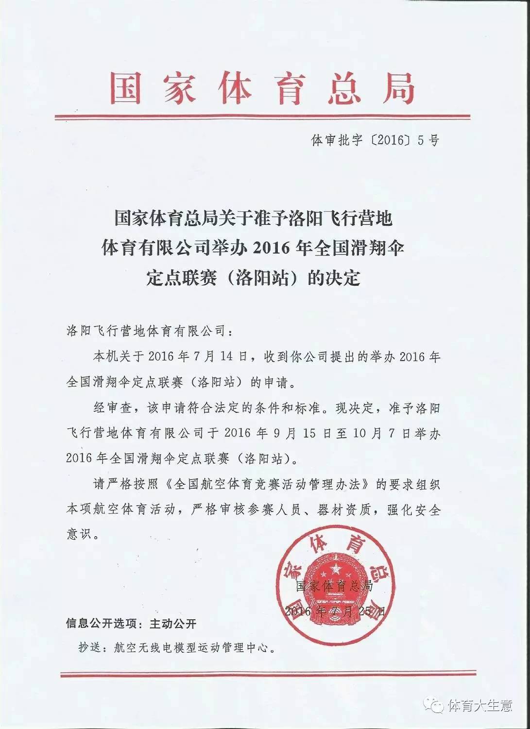 ▼中体飞行旗下的洛阳飞行营地举办比赛的批文直接由国家体育总局下发,监管部门对中体飞行的高度认可和大力支持由此可见一斑