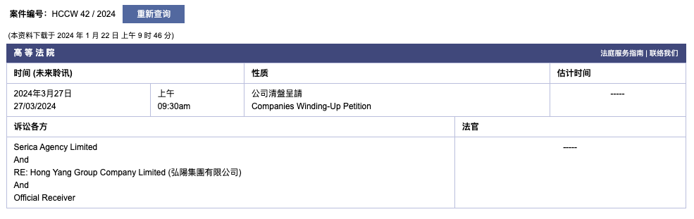 1月22日,根据香港司法机构网站,弘阳集团已收到提交给香港高等法院的公司清盘呈请,聆讯日期为2024年3月27日。该网站显示,Serica Agency Ltd.是此案的另一方。