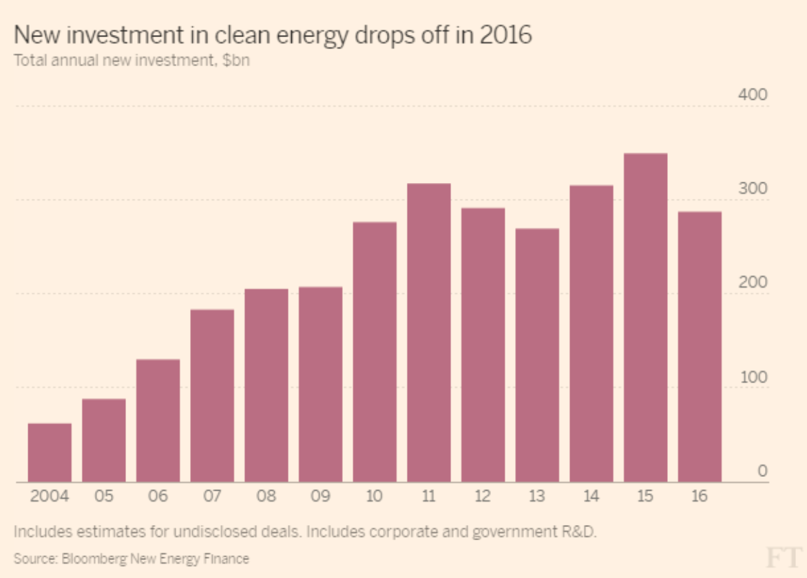 受全球最大的清洁能源市场中国和日本的投资趋缓,2016年的清洁能源投资遭遇了12年来的最大降幅。