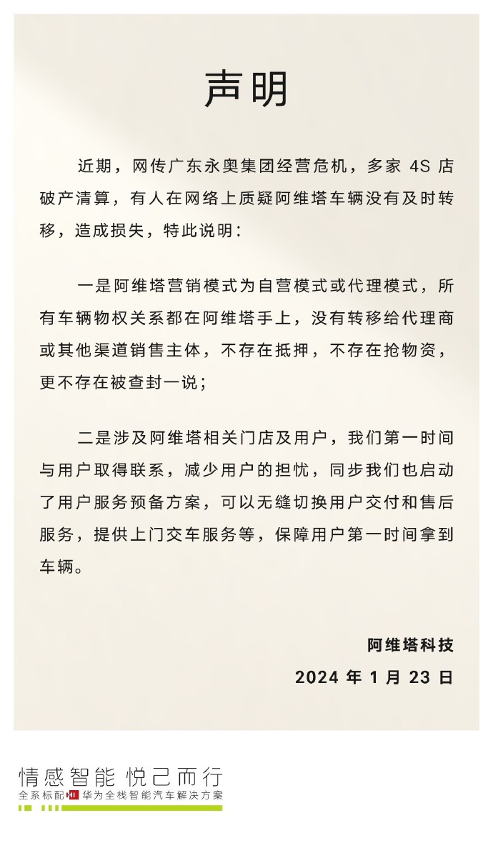 1月23日,阿维塔官方微博发布声明,回应近期网传的4S店相关问题。阿维塔称,其营销模式为自营模式或代理模式,所有车辆物权关系都在阿维塔手上,没有转移给代理商或其他渠道销售主体,不存在抵押,不存在抢物资,更不存在被查封一说。