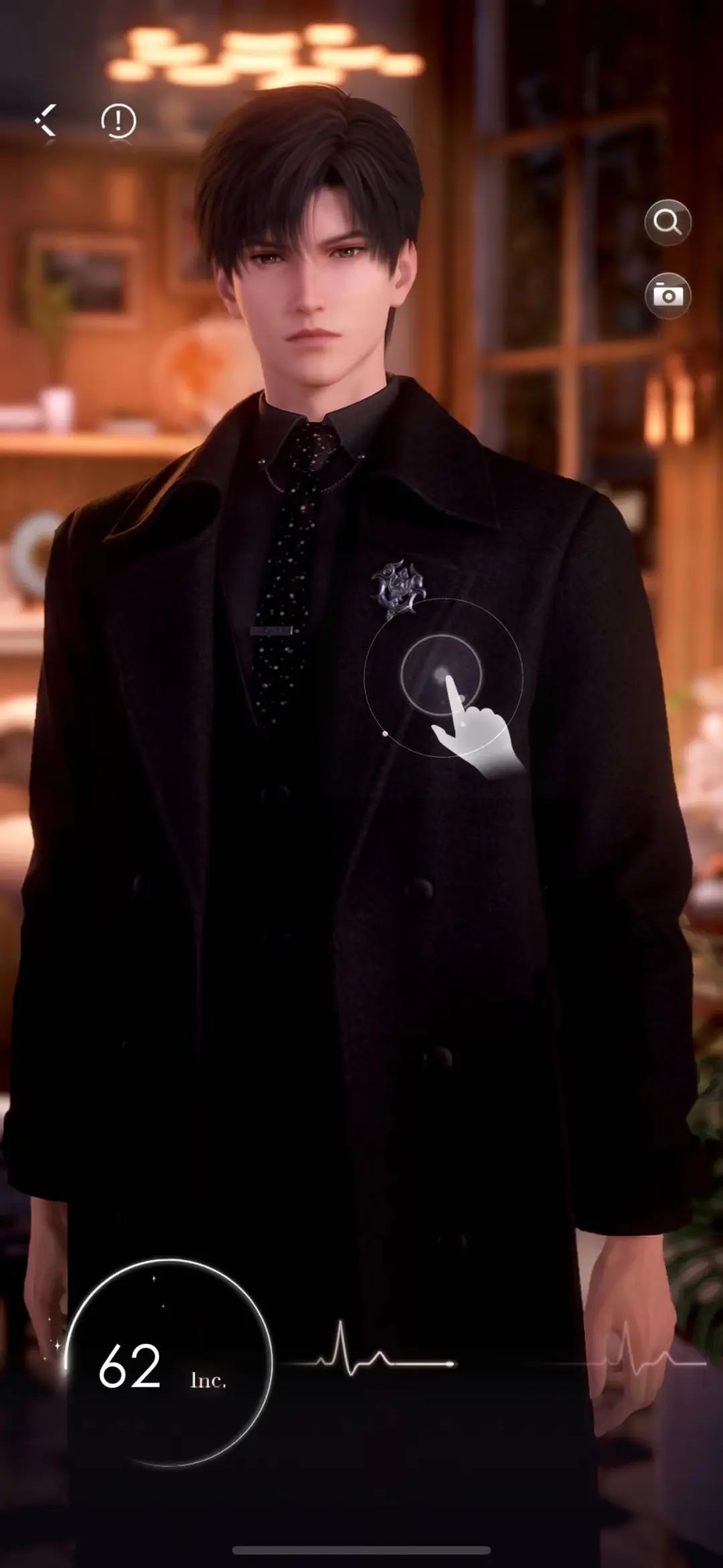 而在剧情演绎之外,主页的人物互动也更加真实与生动了,人物向玩家的靠近与撒娇捧脸,玩家甚至可以在男主心脏位置通过长按的震动反馈,去模拟手掌紧贴人物感受男主心跳的体验,进一步加强了游戏的代入沉浸感。