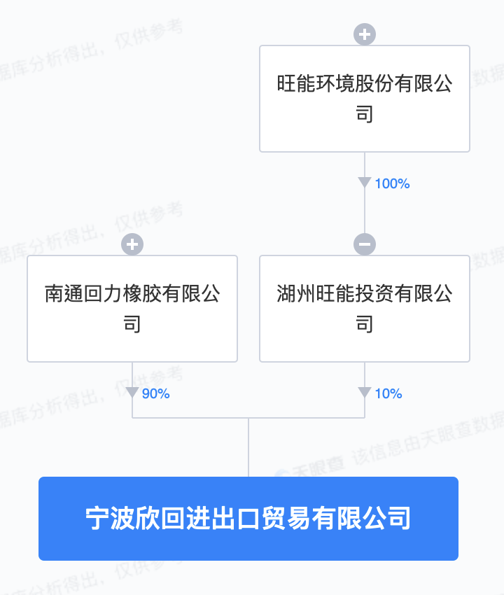 天眼查APP显示,近日,宁波欣回进出口贸易有限公司成立,注册资本500万元,经营范围包含:新材料技术研发;资源再生利用技术研发;再生资源销售等。天眼查股权穿透显示,该公司由旺能环境全资子公司湖州旺能投资有限公司、南通回力橡胶有限公司共同持股。