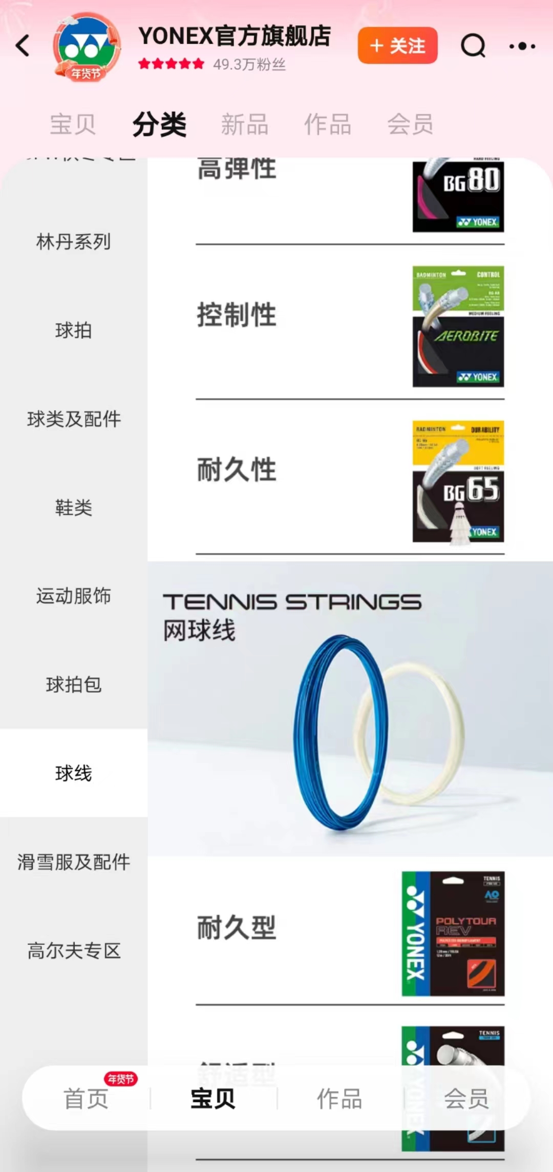 界面新闻发现,在YONEX的天猫官方旗舰店里,已经不按项目给产品分类,而是在球拍、球线、球包里再细分羽毛球和网球产品。品牌似乎有意从“羽毛球专业品牌”向“羽球、网球专业品牌”的定位转型。