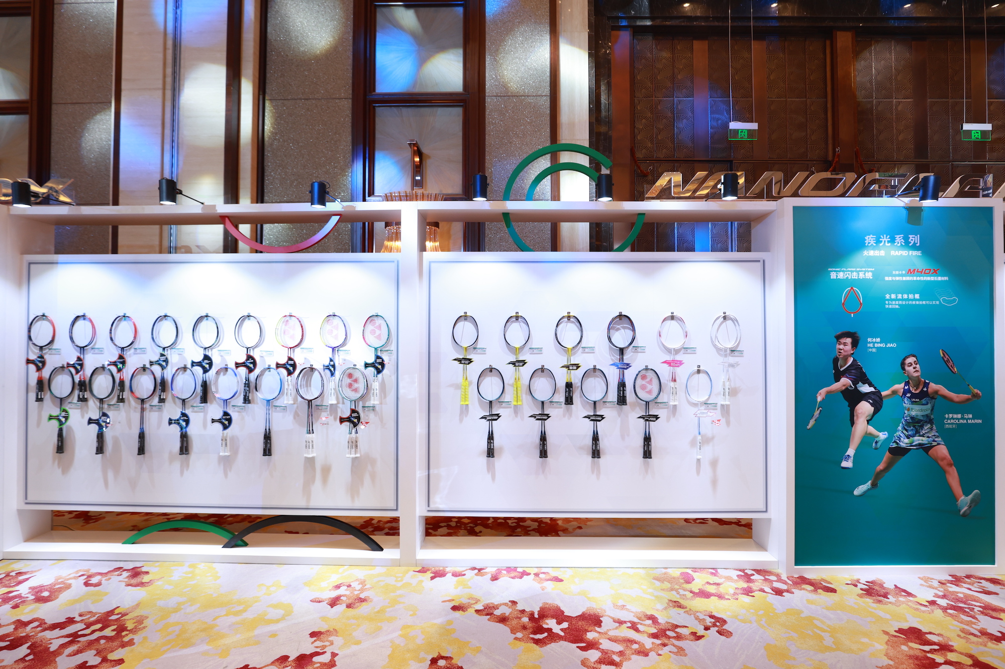 在会议上,YONEX介绍了品牌最新上市的疾光NEXTAGE羽毛球拍、88D羽毛球鞋等羽毛球产品,还邀请了奥运冠军蔡赟、王懿律为其站台。