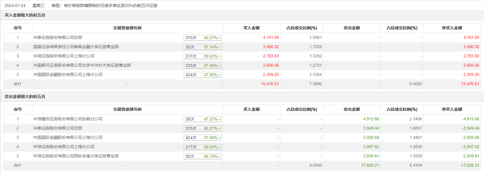 1月24日,宏盛华源今日涨4.99%,龙虎榜数据显示,上榜营业部席位全天成交3.31亿元,占当日总成交金额比例为15.81%。其中,买入金额为1.55亿元,卖出金额为1.76亿元,合计净卖出2151.6万元。