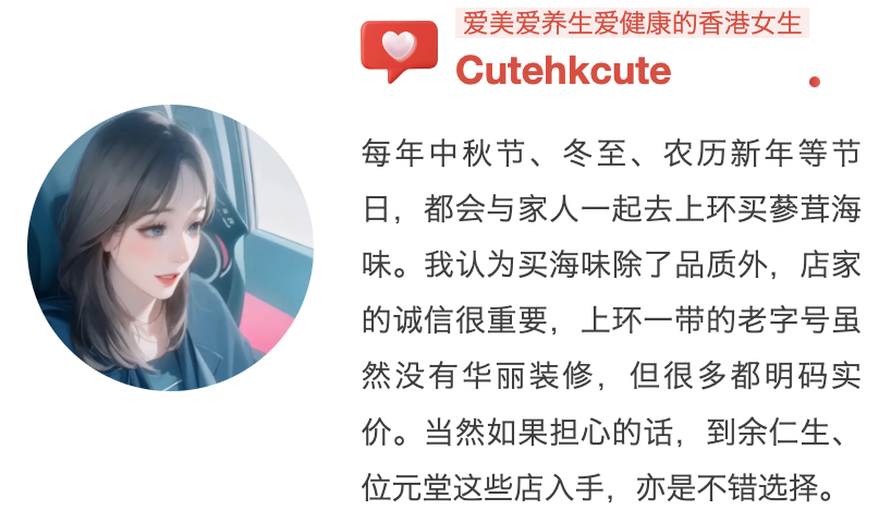 农历新年前,这条街往往挤满了采买年货的人潮,热闹非凡。从小就跟着妈妈办年货的香港女孩Cutehkcute对海味街淘货颇有心得。例如选购鲍参翅肚等较昂贵的海味珍品时,最好货比三家,优先选择有正规资质证书和明码标价的店铺。德辅道西一带有很多经营海味批发兼零售的店铺,鲍鱼和花胶从几十块的亲民产品到上万的精品都有,自用或送礼都有宽裕的选择。“年轻一辈可能不太懂得如何处理蔘茸海味,现在这些店铺都会提供一些海味汤包,处理上相对简单,菜式做出来高大上,亦能款待亲友,”Cutehkcute说。