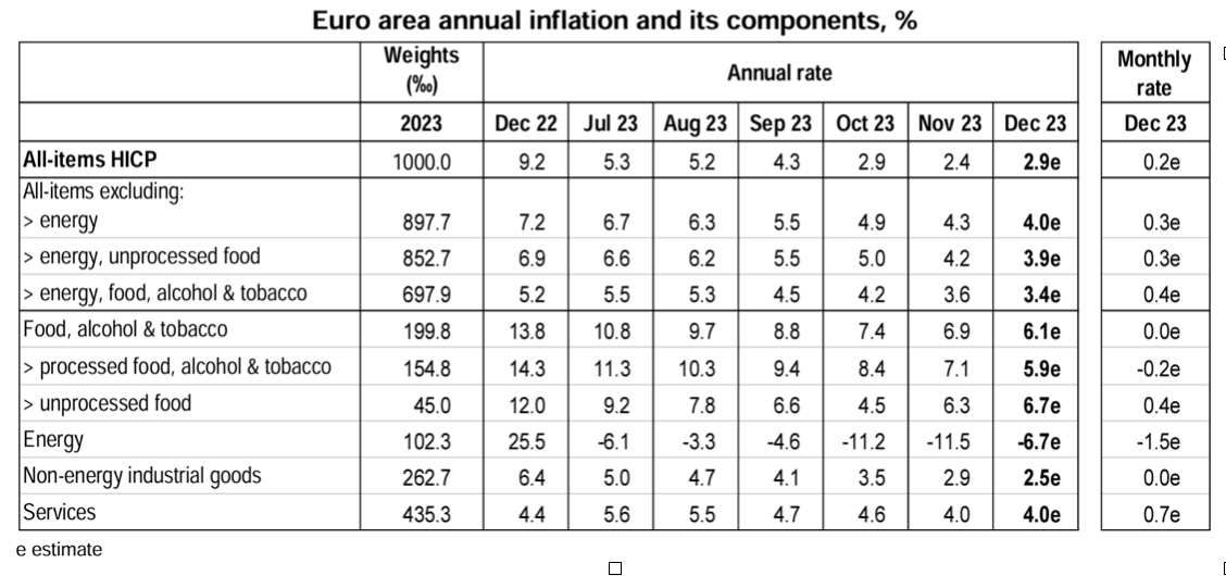 根据欧盟统计局1月5日公布的通胀数据,欧元区12月通胀初值为2.9%,虽较11月的前值(2.4%)再度抬头,但总体而言仍保持着从去年7月5.3%一路快速下跌的趋势。扣除能源和食品价格的核心通胀率同样持续走低,已从去年7月的5.5%下降至3.4%。