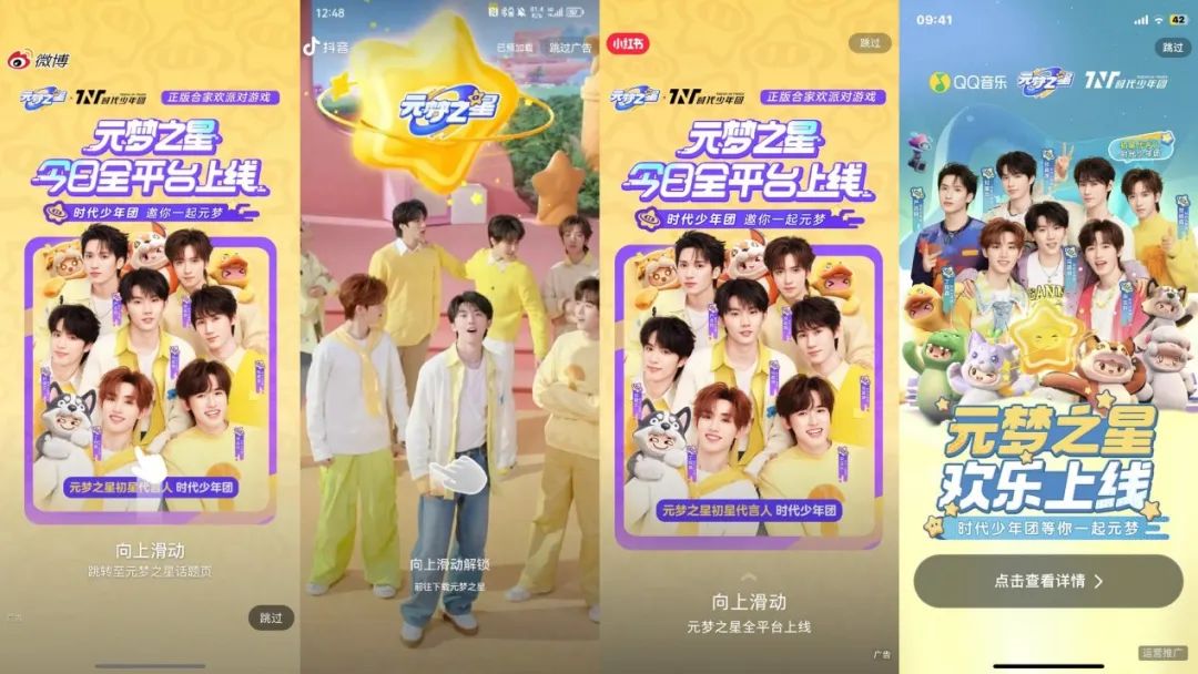 在《元梦之星》的豪华定档发布会上,元梦宣布首期投入14亿元,首日买量投放超过2.7万组,邀请时代少年团、何同学、张大仙、老番茄、手工耿等超600名头部明星KOL推广。同时,对内打通所有流量入口,通过微信朋友圈、视频号、QQ、腾讯新闻、《王者荣耀》联名皮肤集中倒流,对外如孔雀开屏一般霸屏抖音、B站、微博、小红书、微博等主流平台开屏页。