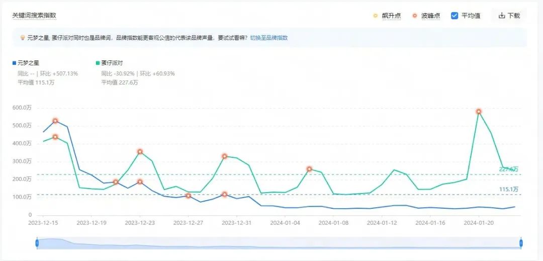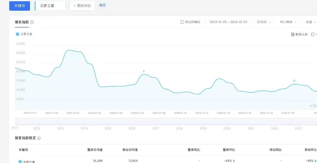同样,从百度指数上来看,截止1月23日,“元梦之星”相关搜索量逐步下滑,讨论热度消退。