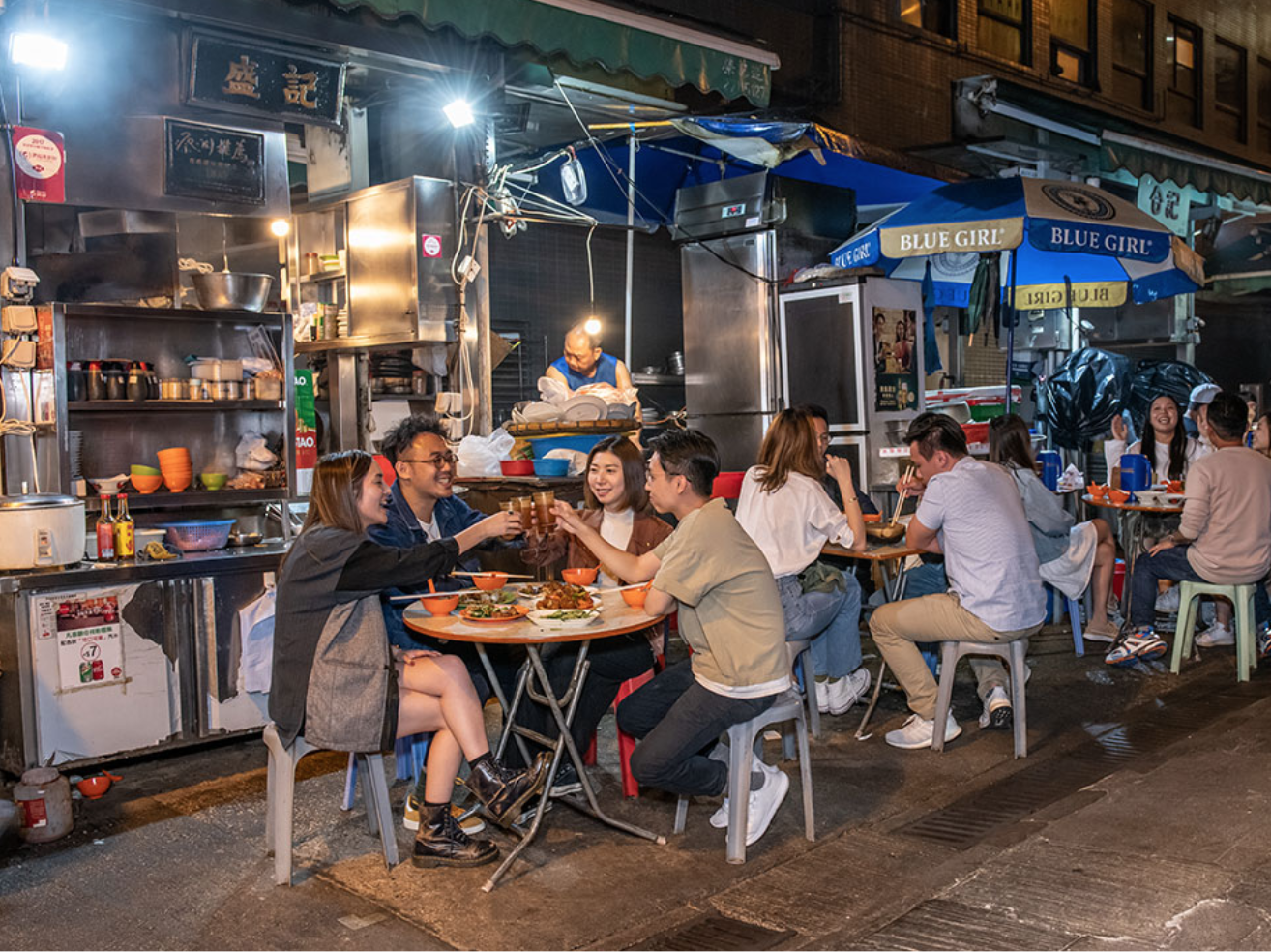 在士丹利街一条细长的巷子中,数十张紧凑摆放的桌子也容纳不了顾客的热情。赶上排大队的时候一只小余干会主动跟店家提出搭桌,与五湖四海的陌生人一起坐在红色绿色的塑料椅上吃个热火朝天。在大牌档,人与人的距离无限靠近,等菜的间隙相邻两桌之间甚至还会闲聊起来,交换一下好吃的菜式和旅途的趣闻。露天灶台食物爆炒的香气扑面而来,吆喝声、锅铲声、喧哗声、碰杯声共同谱出一曲大排档协奏曲。