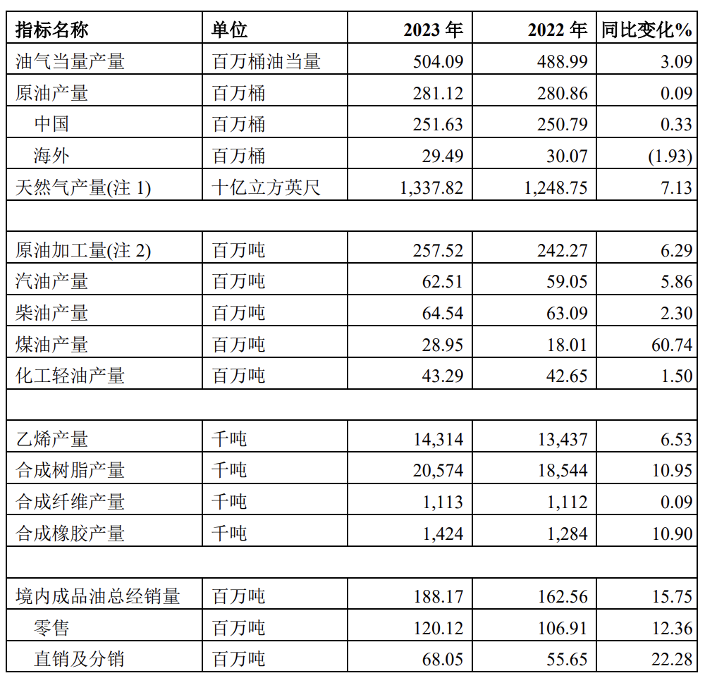 中国石化1月26日公布2023年生产经营业绩,2023年油气当量产量504.09百万桶油当量,同比增长3.09%;境内成品油总经销量188.17百万吨,同比增长15.75%。