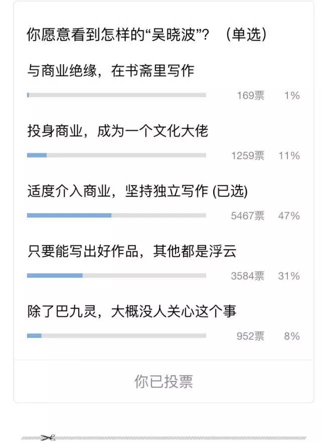 “我是一个文人还是商人?”,这个问题吴晓波也在问自己,他是这么回答的:以旁观者的姿态介入,以独立、建设性的精神看待商业以及参与商业——我愿意用这样的答案,回复所有关心我的同学们。而这篇文章下面发起的一项关于“你愿意看到怎样的“吴晓波”的投票也很有意思,排名最高的两项分别是:适度介入商业,坚持独立写作;只要能写出好作品,其他都是浮云。