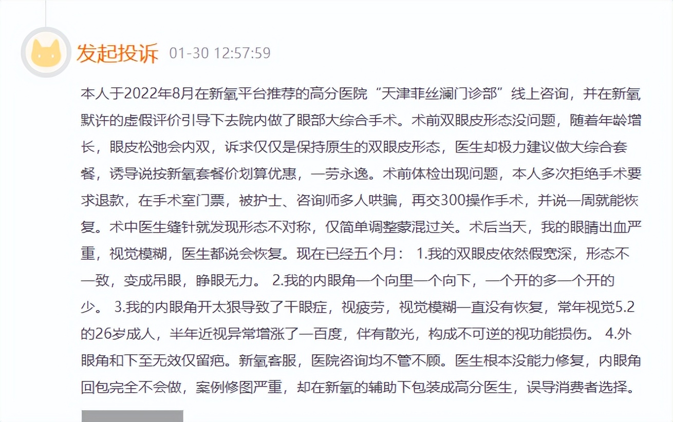 图源:黑猫投诉,用户反馈手术效果不佳,但最终平台却与机构“踢皮球”