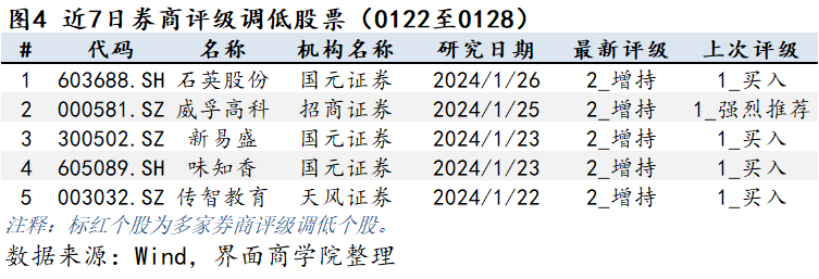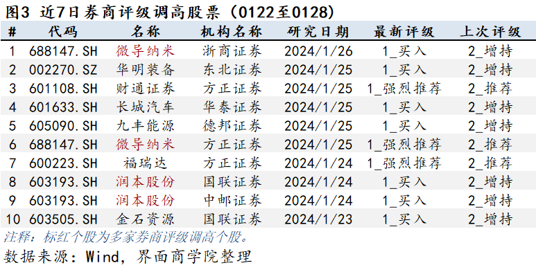 券商对上市公司的观点通常保持连贯一致,但当市场情况或公司基本面发生较大改变,券商对上市公司判断发生改变时会调整相应的公司评级。上图为券商个股在过去一周的评级上调情况,按研报日期排序。券商评级数字为1即为第一档,即最佳,5为最末档,即最差。由于各券商对评级的文字描述不尽相同,所以评级调整以评级数字为准。