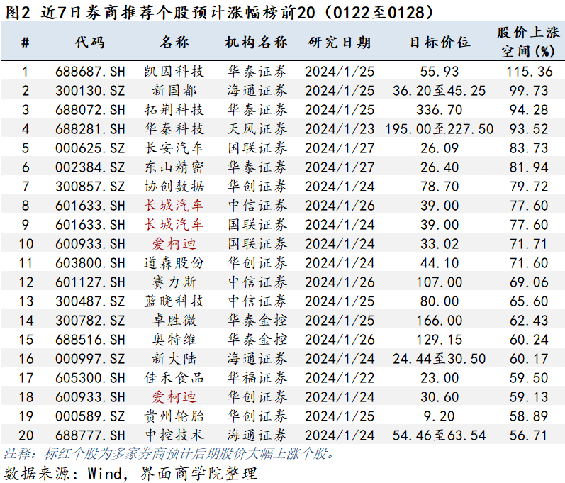 上图将券商近7日推荐的个股按预期股价上涨空间由高到低排序,股价上涨空间计算基数均以最新交易日收盘价为准,其中券商目标价通常指未来3至6个月券商预测目标价。其中,券商研报预测A股上市公司涨幅排在第1位的是凯因科技(688687.SH),推荐券商为华泰证券。该券商给出个股目标价55.93元,相较最新个股收盘价上涨空间为115.36%。