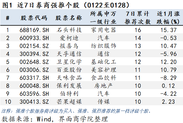 上图将券商近7日(1月22日至1月28日)推荐的个股按被推荐次数由高到低排序。共有120只个股得到券商周内多次推荐。推荐次数排在第1位的是石头科技(688169.SH),公司所属申万一级行业为家用电器,本周共有16家券商对该公司进行推荐。