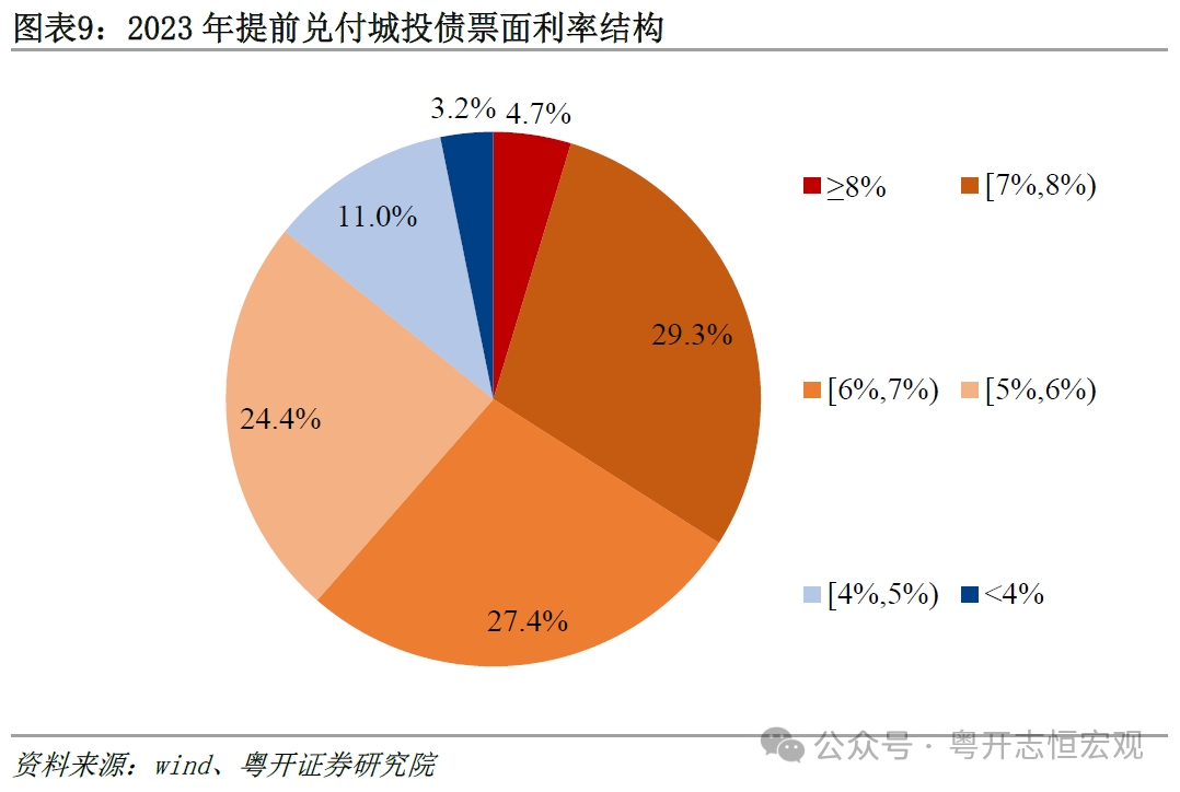 一揽子化债的重要思路是以低息换高息、逐步压降成本以缓解城投短期偿债压力。2023年提前兑付的城投债以高息债券为主,5%及以上城投债占比85.8%,其中,7%-8%的城投债占比为29.3%,8%及以上城投债占比达到4.7%。从存量城投债来看,5%以下城投债占比达到69.6%,8%及以上存量高息城投债规模为782亿元,占比仅有0.6%。