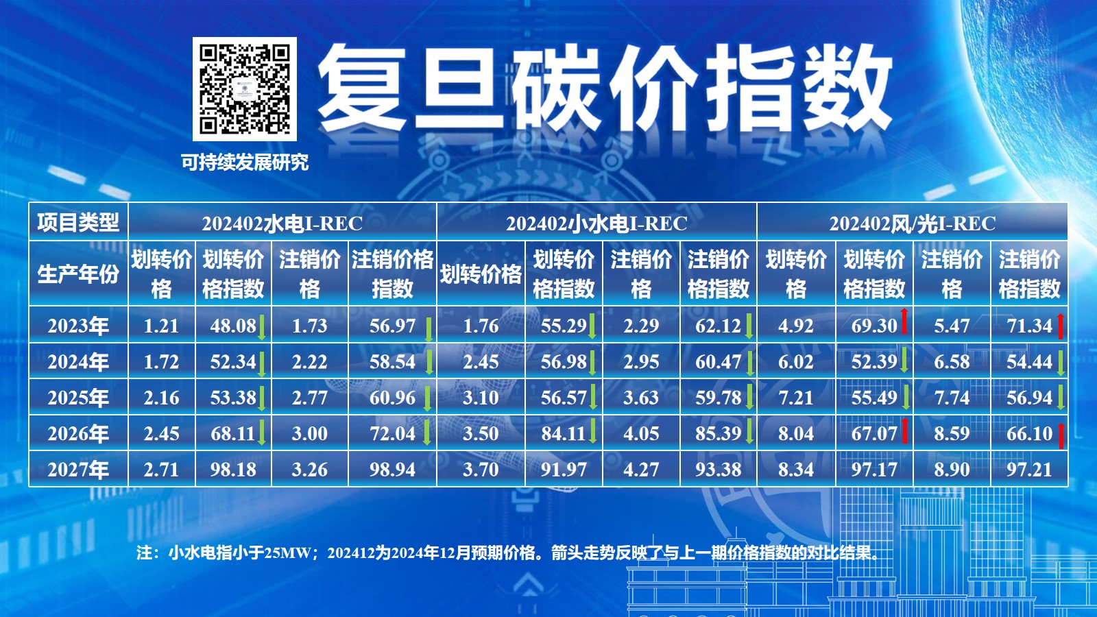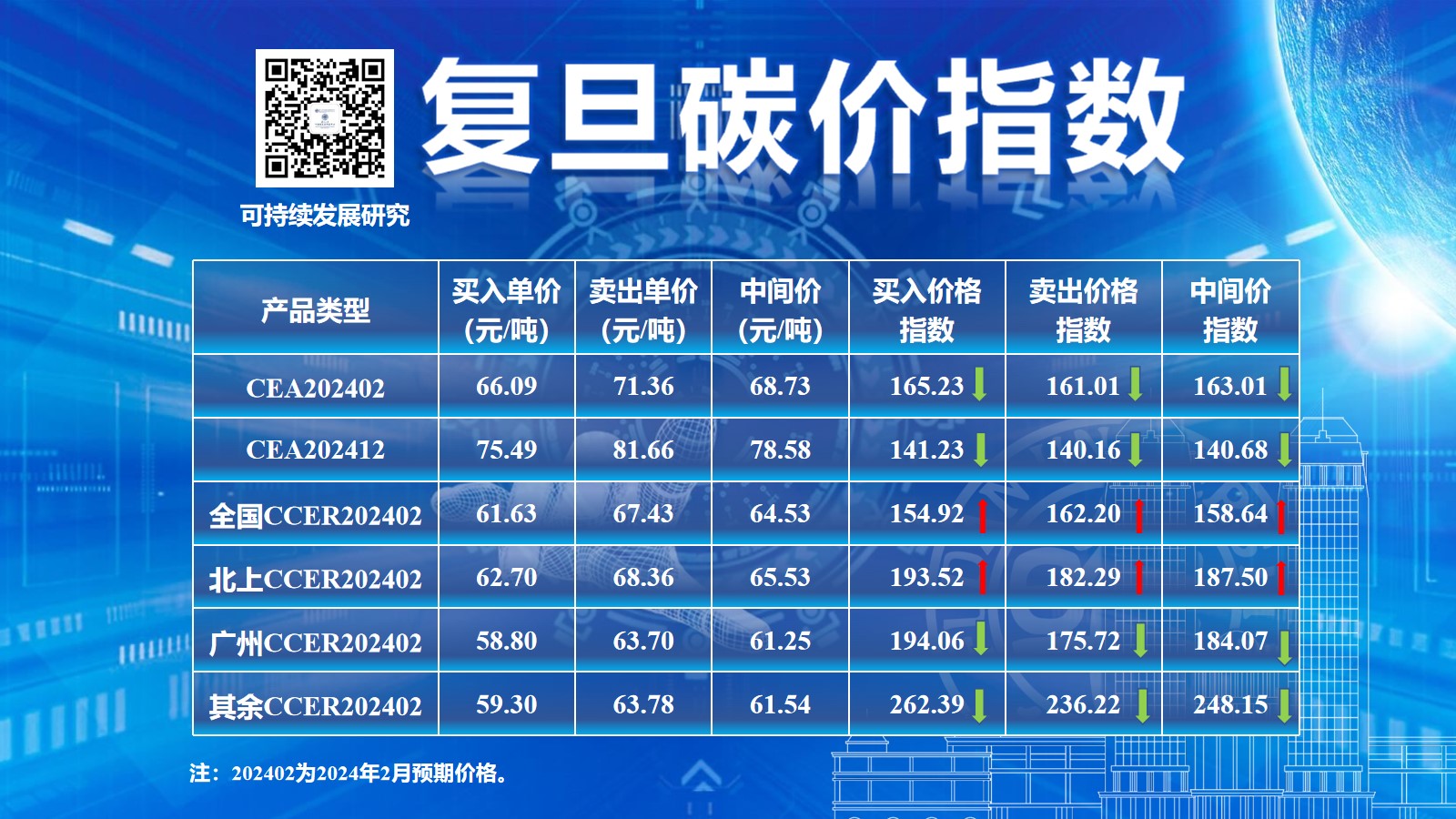 1月29日,复旦大学可持续发展研究中心(以下简称“研究中心”)公布了2024年2月复旦碳价指数结果。此次公布的复旦碳价指数包括六项价格指数,涉及CEA、CCER和I-REC三种碳资产,具体如下图所示: