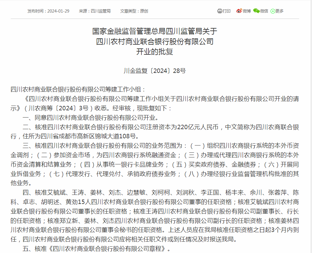 1月29日,国家金融监督管理总局四川监管局发布关于四川农村商业联合银行(以下简称四川农商联合银行)开业的批复,同时,核准其注册资本为220亿元。