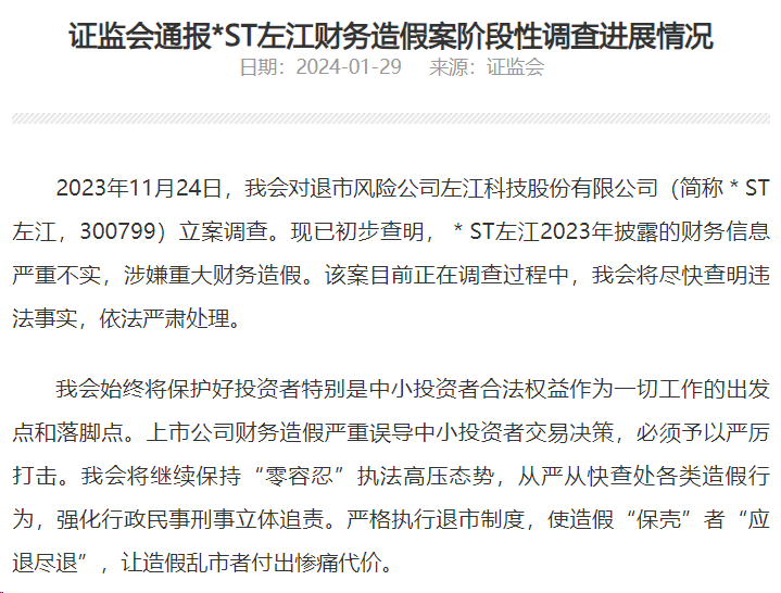 证监会官网1月29日消息,2023年11月24日,证监会对退市风险公司*ST左江立案调查。现已初步查明,*ST左江2023年披露的财务信息严重不实,涉嫌重大财务造假。该案目前正在调查过程中,证监会将尽快查明违法事实,依法严肃处理。