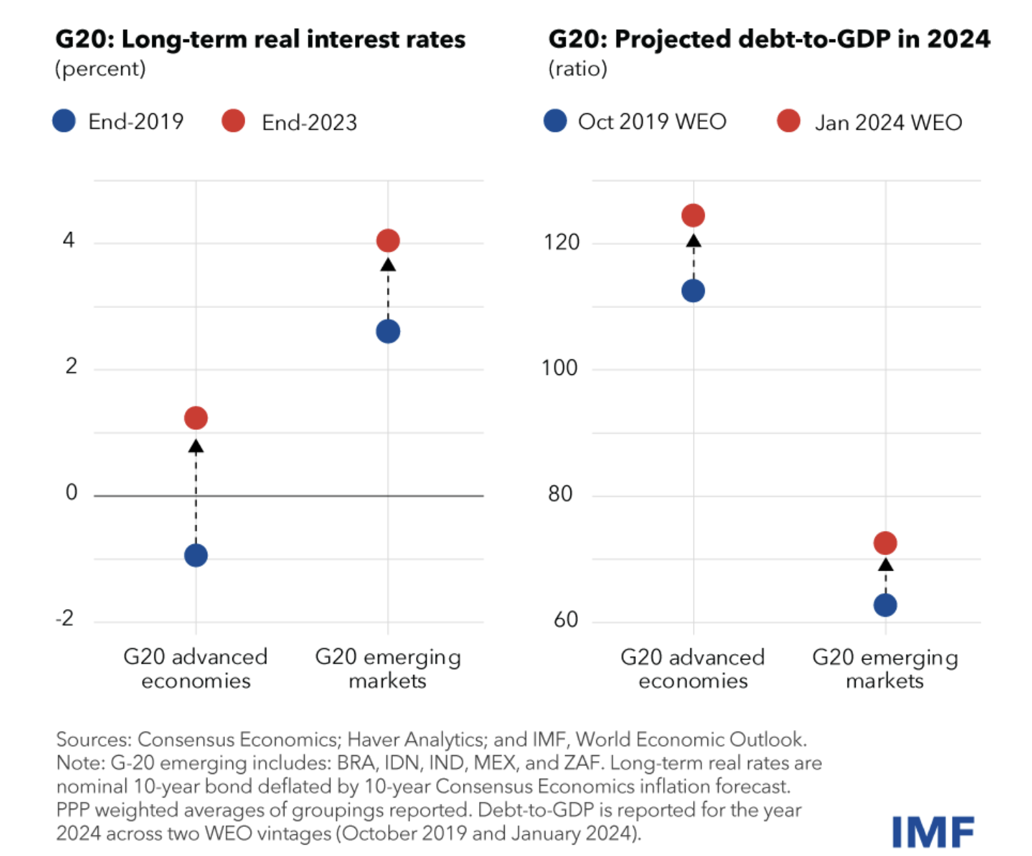 在面对新冠疫情和能源危机时,各国政府都通过一系列纾困措施为民众和企业提供帮助,并一路推高了公共债务水平。例如G20中的发达经济体在过去四年内公共债务与GDP之比突破了120%,G20新兴经济体的这一比例也突破了70%。而随着利率的大幅上升,各国的借贷成本和再融资成本反而在不成比例的上升。