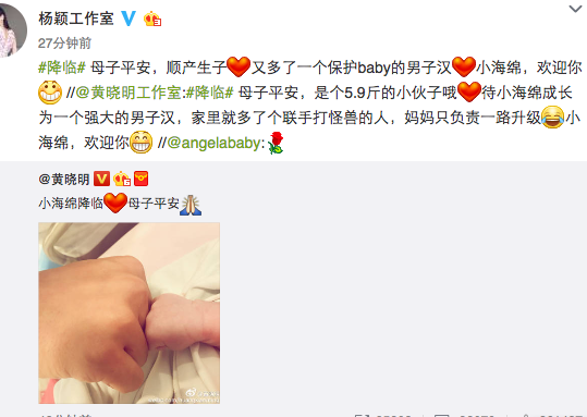 生个娃有必要搞的全天下都知道吗?好,现在知道了,黄晓明杨颖生娃了!OK可以了,现在能消停点不,超级烦
