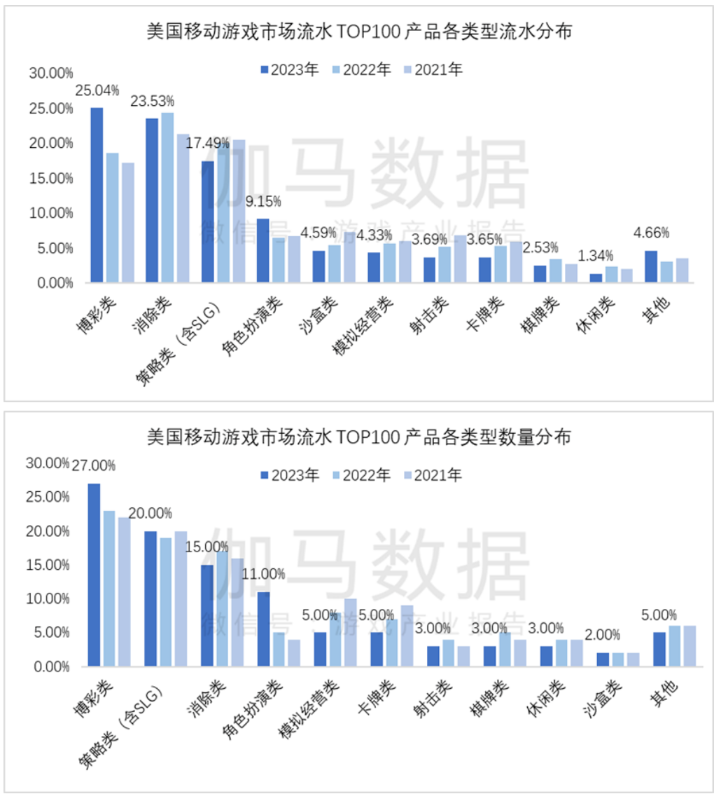 而在美国市场,RPG手游流水和数量只占9.15%和11%,欧洲为8.37%和8%,相比更多依靠SLG贡献出海影响力。