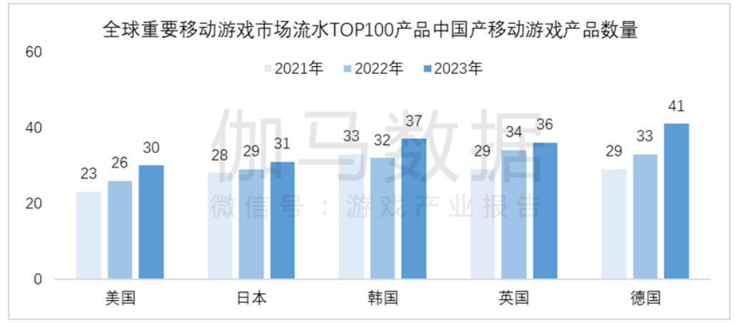 报告指出,2023年中国移动游戏的出海游戏收入主要集中在美国、日本、韩国、德国等国家。其中,美国、日本、韩国三个国家为中国出海游戏提供了超过五成的海外收入。