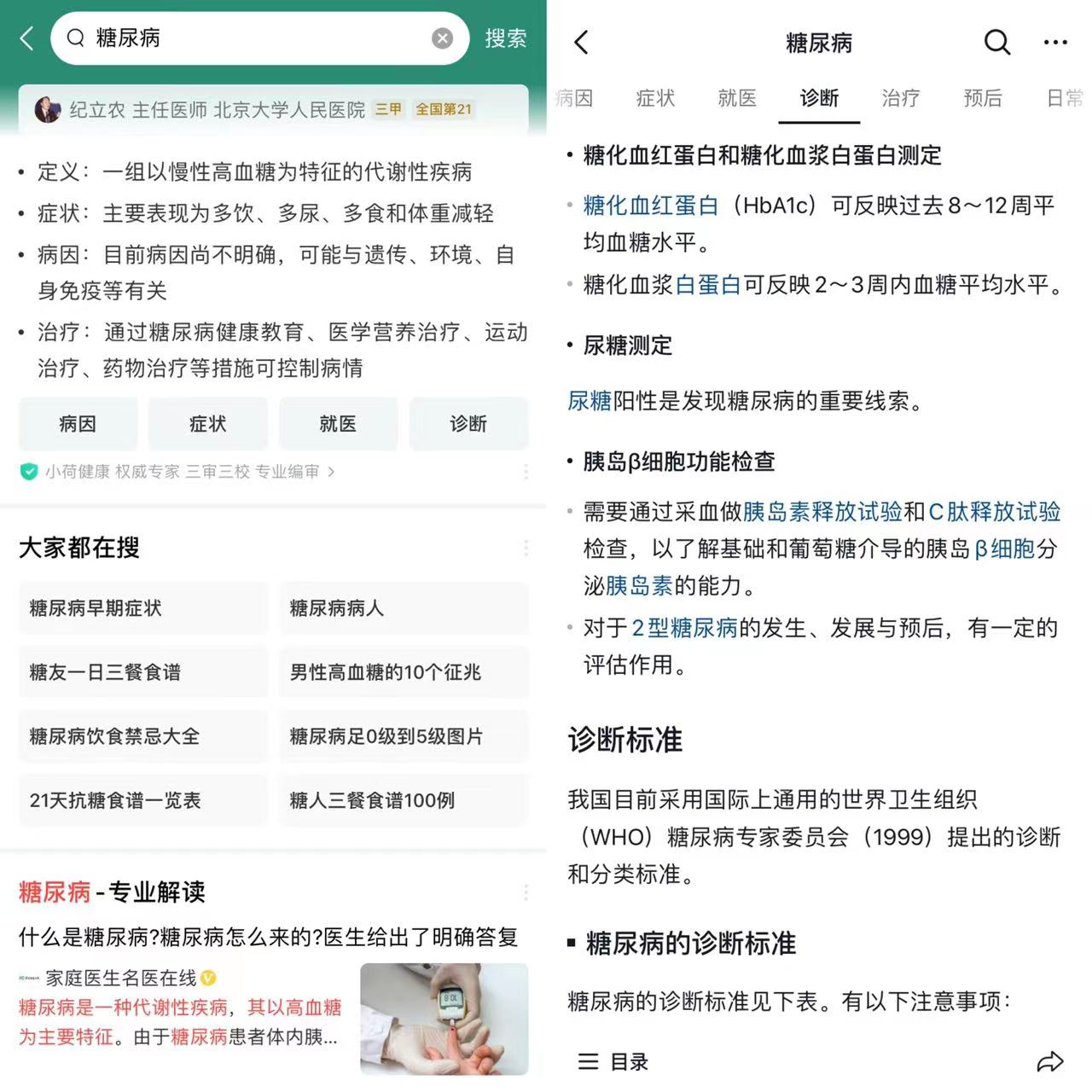 需要指出的是,即使被评价为“最权威的医学知识库”,百科名医网也不是唯一可以提供医学资讯的内容库。并且,平台还可以自主搭建内容。从结果上看,若是眼下在今日头条上搜索“糖尿病”,首条内容来自小荷医典。小荷医典是字节跳动体系内部的健康内容平台。