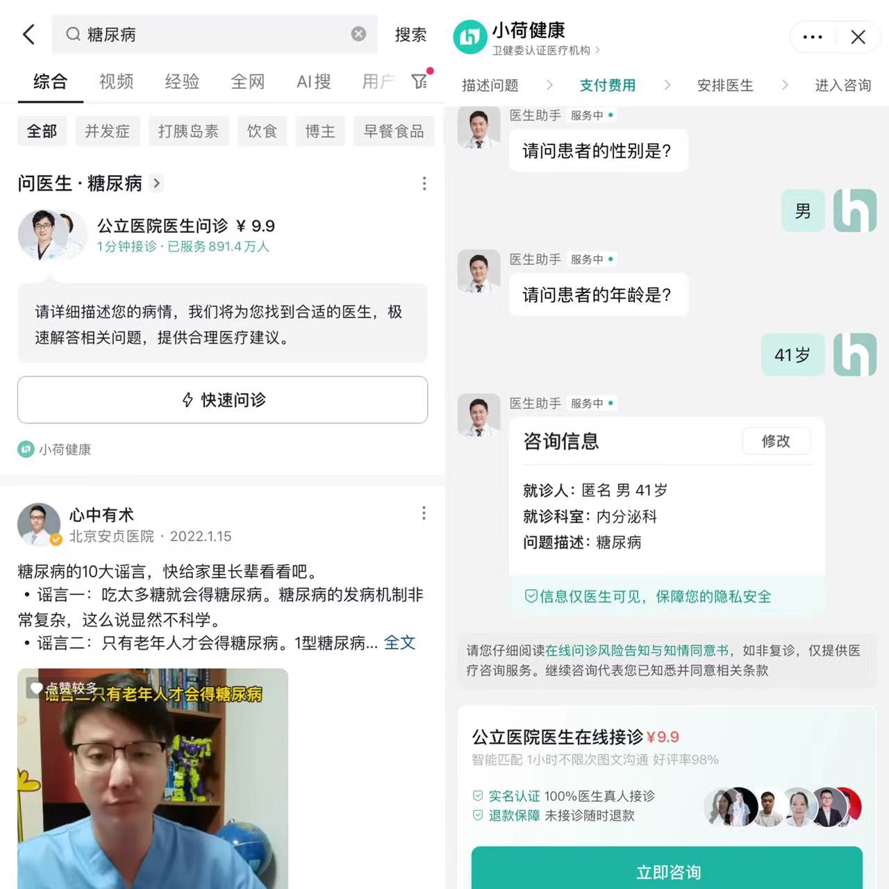 除了代表着权威的医生,抖音的短视频还包括了患者视角,包括但不限于肌肉男测血糖,面容娇俏的女性讲述她不幸罹患一型糖尿病的故事等。另外,在这些内容的间隙,抖音还能提供 “快速问医生”这一功能,点击之后,来自小荷健康的医生助手会询问患者性别、年龄这两项信息,随后便同步给予公立医院在线9.9元接诊的链接。