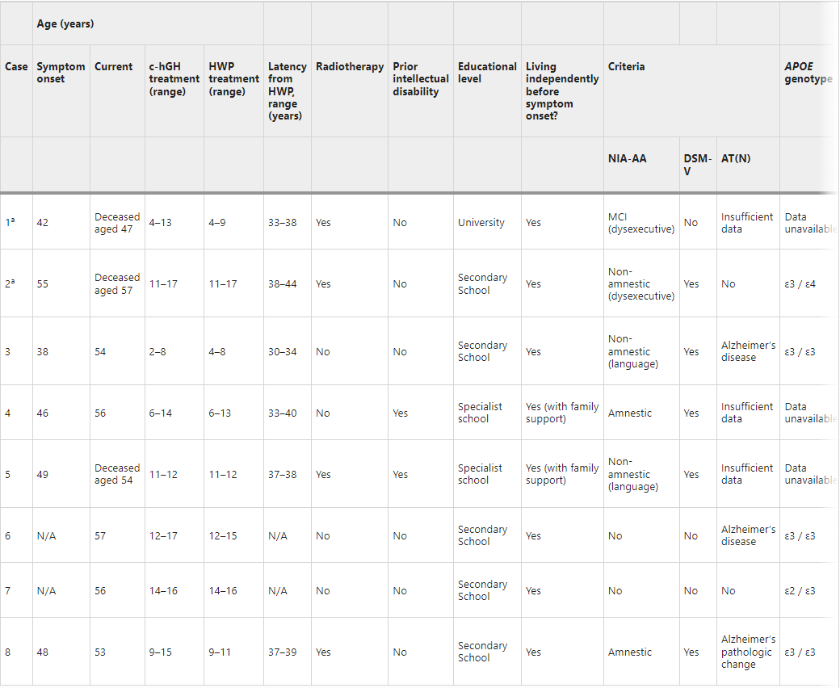 而在本次发表的研究中,John Collinge团队报告了另外8位有c-hGH治疗史的患者。这8个病例中,有5人出现了与早发性痴呆一致的症状,即在两个或更多领域出现了进行性认知障碍,严重到足以影响日常生活的正常活动。其中,4名患者的年龄在38岁至49岁之间,另一名患者症状发作的年龄为55岁。