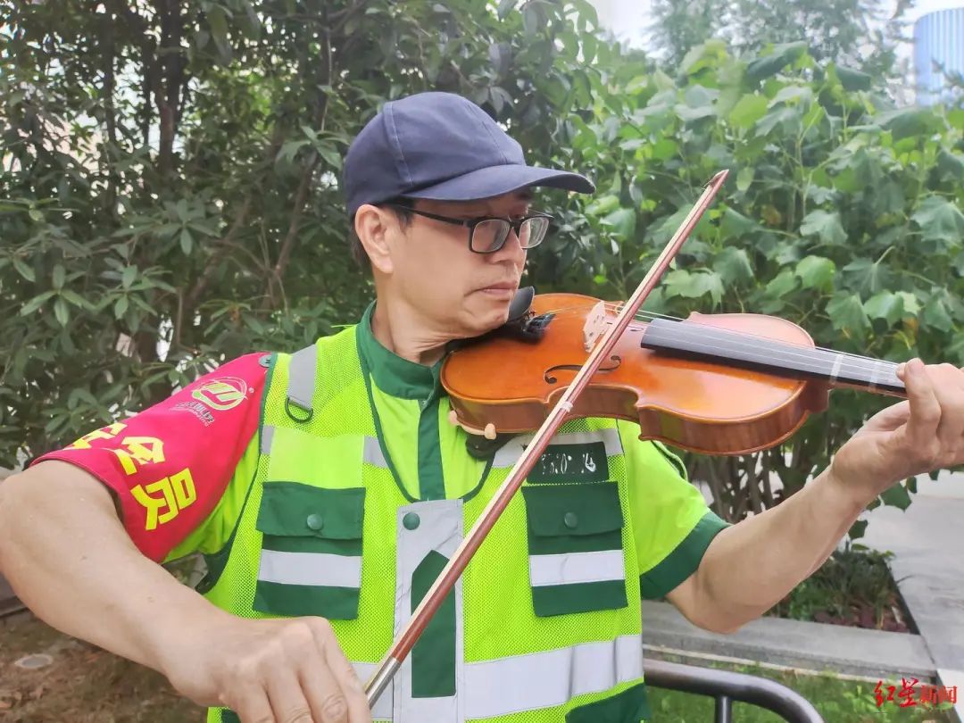 60多岁的汤道宣已经做了五年的环卫工作,在扫落叶、捡白色垃圾、收袋装垃圾之余,他还有自己的业余爱好,拉小提琴。每每在工作之余,寻得一些闲暇时间,他就会拿出随时放在快保车内的小提琴箱。在一个建筑物旁,熟练地打开琴箱,安装好肩托,然后摘掉手套。“我对现在的生活状态很满意,不是很忙碌,每天还可以抽空闲的时间来拉一拉琴。为了方便练习,随时能拿出来‘秀’一下。”