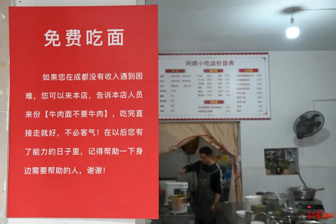 “如果您在成都没有收入遇到困难,您可以来本店,告诉本店人员来份‘牛肉面不要牛肉’,吃完直接走就好,不必客气!在以后您有了能力的日子里,记得帮助一下身边需要帮助的人,谢谢!”位于成都的阿顺小吃店因为这一句暖胃又暖心的暗号而引发热议。