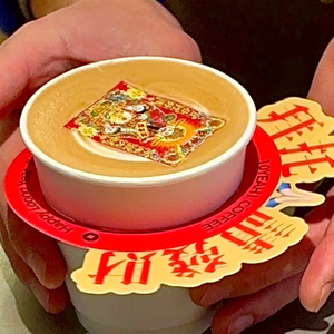 杭州一家咖啡店把财神元素引入到咖啡中,在每杯咖啡上都放了一张用糯米纸做的“财神年画”。
