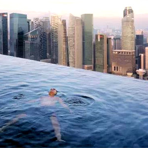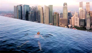 一个男人漂浮在新加坡滨海湾金沙酒店57层楼的露天游泳池里,远处是新加坡最繁华的金融街。摄影 | Paolo Woods 和Gabriele Galimberti,2013