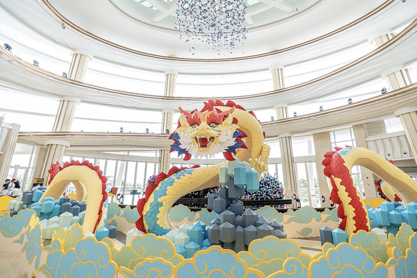 临近春节,新年的龙形雕塑、灯组,已经在三亚亚特兰蒂斯度假区各处亮相,吸引众多游客拍照留念,增添了浓厚的新年氛围。在酒店大堂,总长度近30米的纸雕龙盘踞其中,栩栩如生,这组作品由十多位纸艺匠人耗时四十余天,是国内罕见的以龙为造型的大型纯手工原生纸艺装置作品。在水世界门前广场,同样矗立着一组大型灯组,夜幕降临之时,灯组流光溢彩,洋溢着满满的节日氛围。