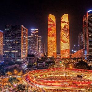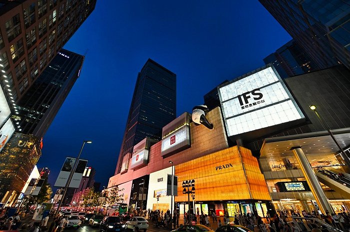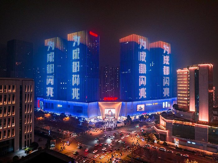 春熙路太古里片区是成都最时尚、最繁华、最具蜀都味的商圈之一,景观光彩遵循片区人文、时尚、商业等特色,结合“百年金街-春熙路”“震旦第一丛林”大慈寺以及水井坊、“交子”等历史遗存特点,整体景观照明以暖黄色泛光照明和商业内透照明为主,以商圈裸眼3D屏作为辅映,展现光影璀璨的高品质夜间消费场景。