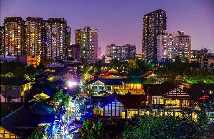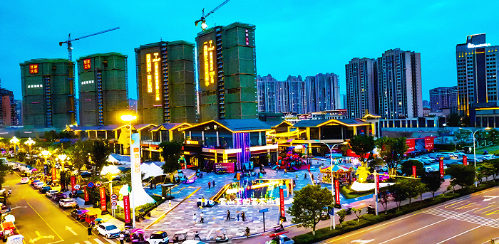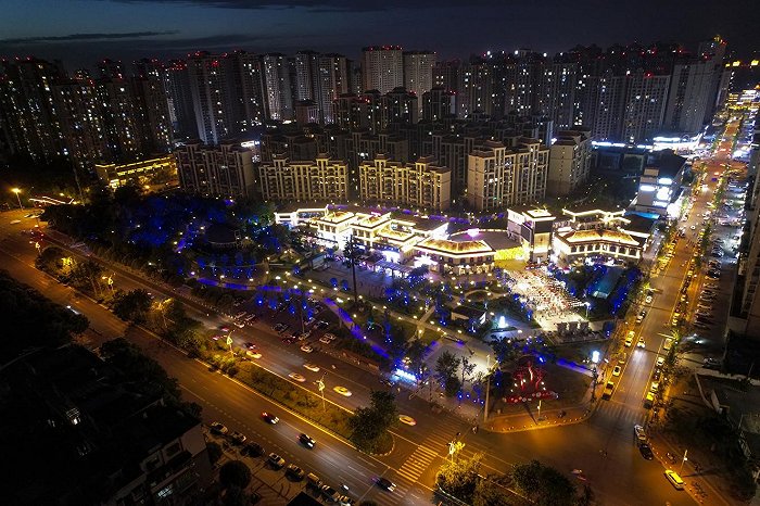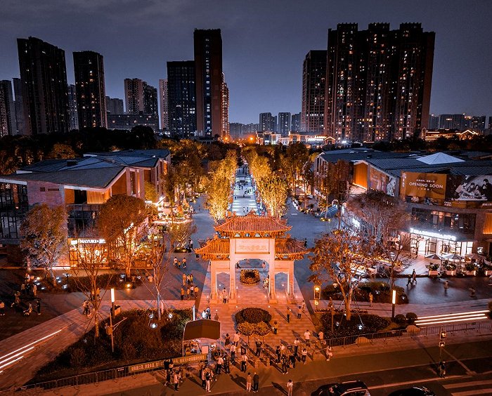 等各类现代景观照明手法的辉映下,伴着风格、形态各异的楼屋建筑,更增添处穿越之幻境,营造出传统与现代、市井与时尚、文化与消费并存的烟火临邛。