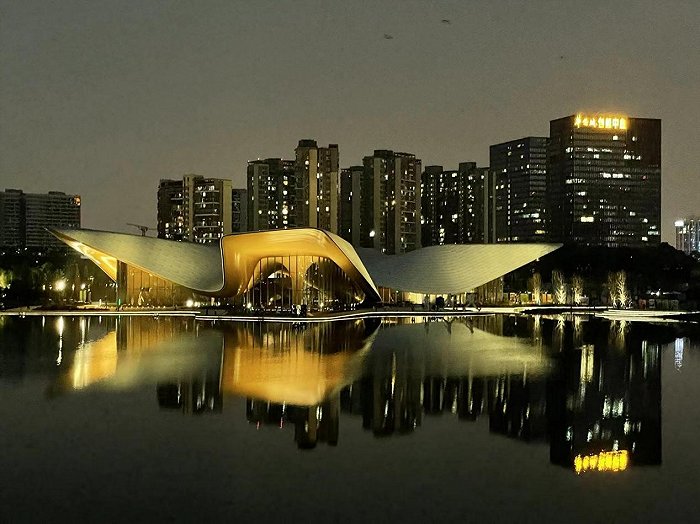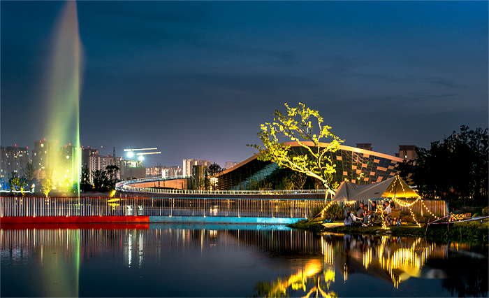 天府艺术公园是以金牛宾馆为核心打造的天府文化新地标,主要包含三坊(文博坊、文商坊、文创坊)、三湖(迎桂湖、荷华湖、芳菲湖)、三馆(天府美术馆、天府图书馆及天府艺术馆)。公园景观照明勾勒场馆造型,烘托园林景观,湖光山色倒影,与商业街区呼应,景观照明设计端庄典雅、造型灵动,一步一景,夜景光彩让人越发感受到湖面的宁静,与大自然的距离更贴近了一步。