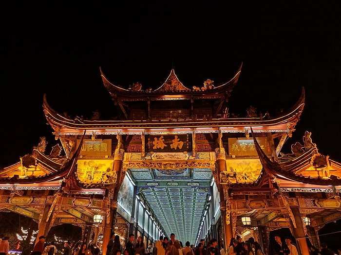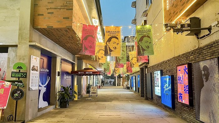 东门市井位于菱窠路街,与李劼人故居比邻而建,完美呈现了公馆群建筑群、铺板小馆、凉亭水榭夜间轮廓,街区市井氛围浓厚,是老成都市井文化美学的体验地。