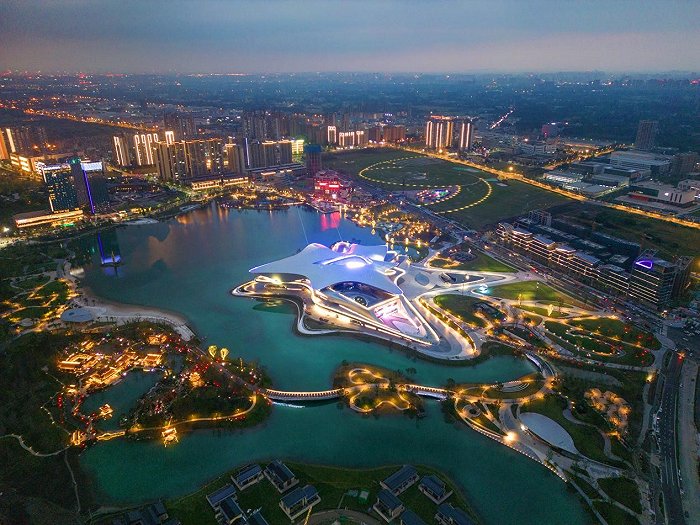成都科幻馆位是第81届成都世界科幻大会的主场馆,场馆整体以自由、扩散、无界的未来建筑形象诠释科学与科幻主题,场馆外观设计融合三星堆金箔面具、古蜀之眼与现代科幻文化。从空中俯瞰,整个场馆如同一片漂浮于大地之上的“星云”,蕴含科幻文化的神秘感和未来感,引起无穷遐想。