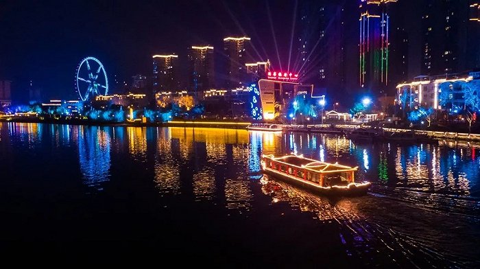 游船夜游毗河湾,观赏山体瀑布景观、长虹喷泉景观、绿岛雾喷、景观大屏幕、蝴蝶喷泉及航道沿线光彩工程等多处景观。2月9日—2月17日