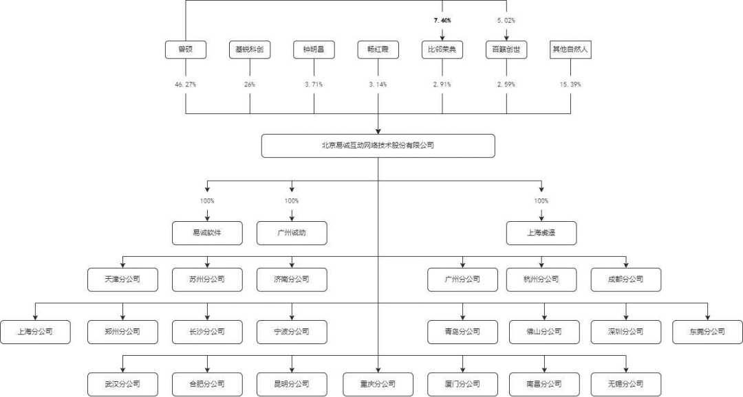 据悉,易诚互动的实际控制人为曾硕,曾硕直接持有易诚互动发行前46.27%的股份,间接控制股份5.5%,合计持股51.76%。