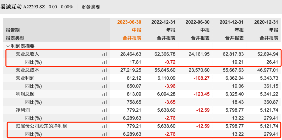 招股书显示,2020年-2023年上半年(以下简称“报告期”),易诚互动的营业收入分别为5.27亿元、6.28亿元、6.24亿元、2.85亿元;同期归母净利润分别为5121.74万元、5798.77万元、5638.60万元、779.21万元。