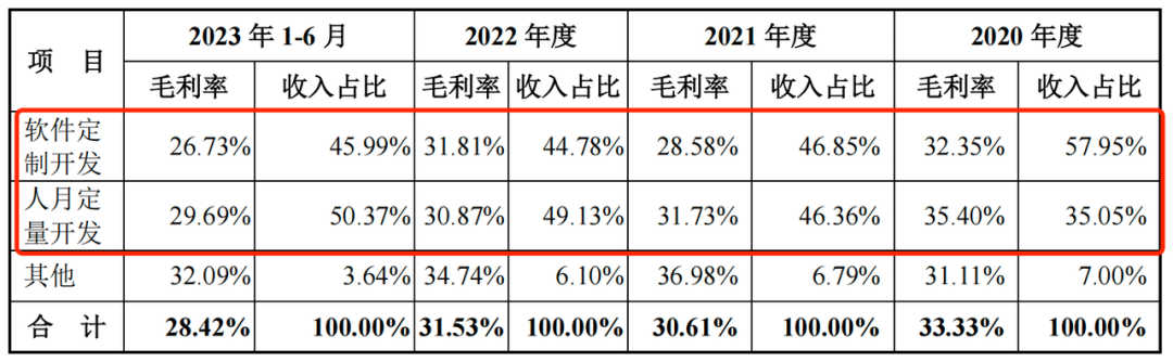 同期,公司人月定量开发业务的毛利率分别为35.40%、31.73%、30.87%和29.69%,报告期下滑5.71个百分点。