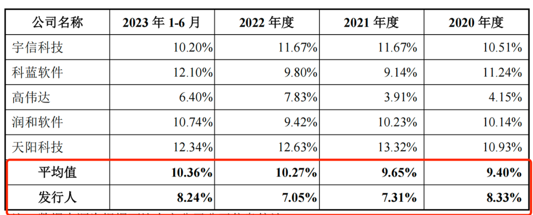 报告期内,可比上市公司研发费用率均值分别为9.40%、9.65%、10.27%、10.36%,均高于易诚互动的研发费用率。