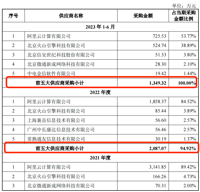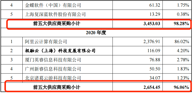 其中,阿里云计算有限公司(以下简称“阿里云”)是易诚互动的第一大供应商,报告期内,公司向阿里云的采购金额分别为2376.91万元、3141.85万元、1858.37万元、725.53万元,占当期采购比例分别为86.02%、89.42%、84.52%和53.77%。