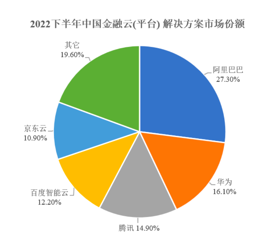 根据IDC,《2022年下半年中国金融云市场—基础设施与解决方案分化明显》数据,阿里巴巴、华为、腾讯、百度智能云、京东云合计占据80.4%的市场份额,头部效应较为明显。阿里巴巴旗下的阿里云市场份额27.30%,排在第一位。