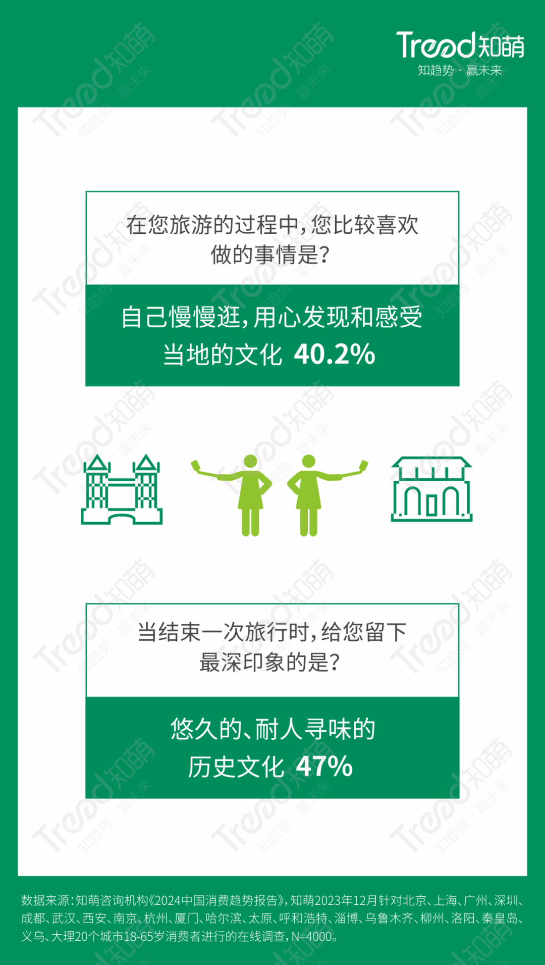 消费者对文化体验旅游的追求不断提升,更愿意追求文化底蕴气息。文化旅游不仅是一种出行方式,还是一种对历史、文化、艺术等方面的探索和体验。知萌报告显示,40.2%的消费者喜欢在旅游的过程中用心发现和感受当地的文化,47%的消费者在旅行结束后对悠久的历史文化流连忘返,消费者越来越注重对文化和历史的探索,在文化旅游中不断提升自己的品味和素养。