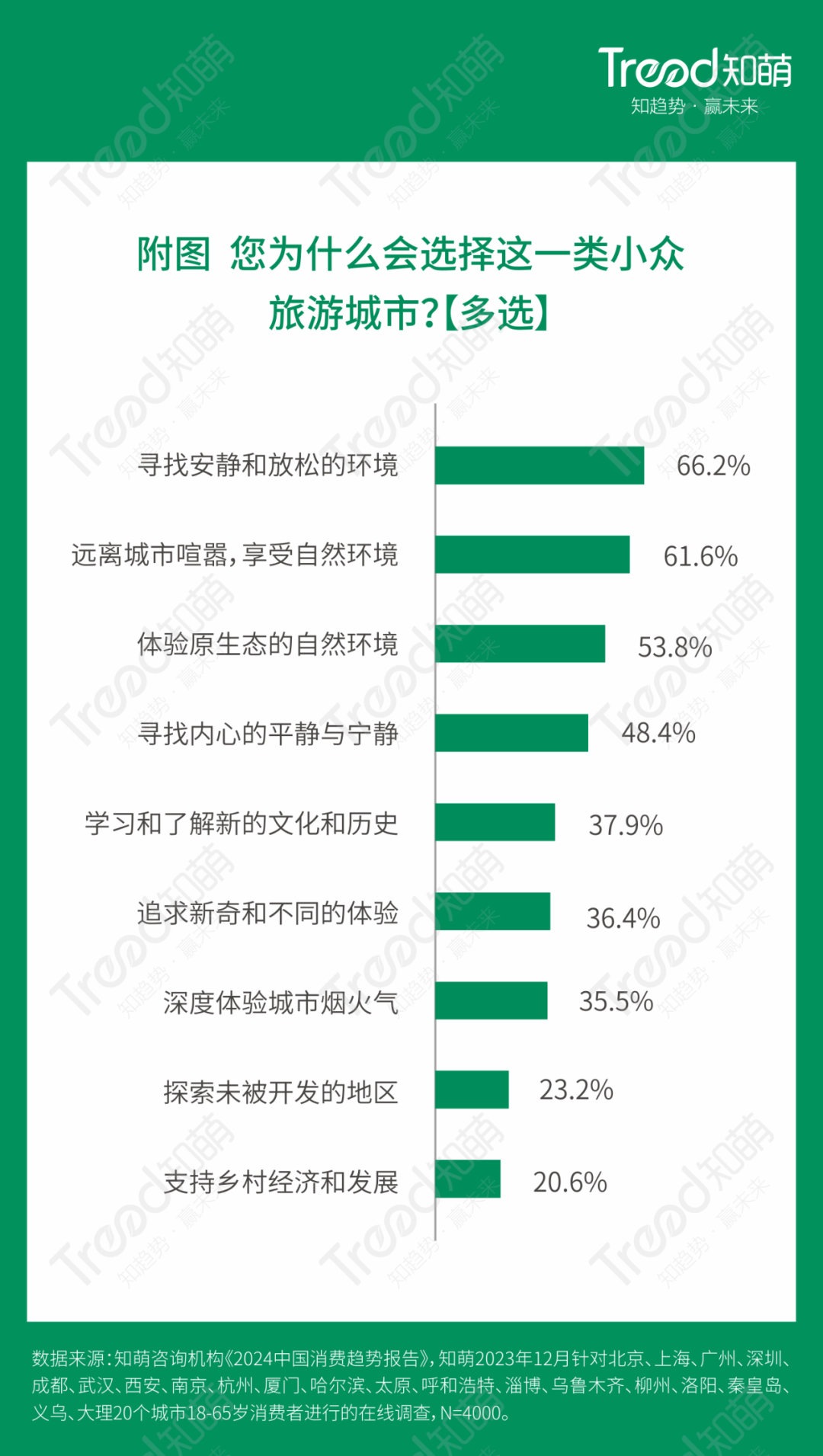 报告显示,超过一半的消费者选择去小众旅游城市是为了寻求安静和放松、远离城市喧嚣和体验原生态的自然环境。反向旅行让消费者远离拥挤的热门旅游景点和目的地,探索更加未知、独特和小众的地方,深入当地人文,融入当地生活,沉浸式体验城市烟火;同时还可以不断挑战自我和开阔视野,获得更多惊喜和乐趣。